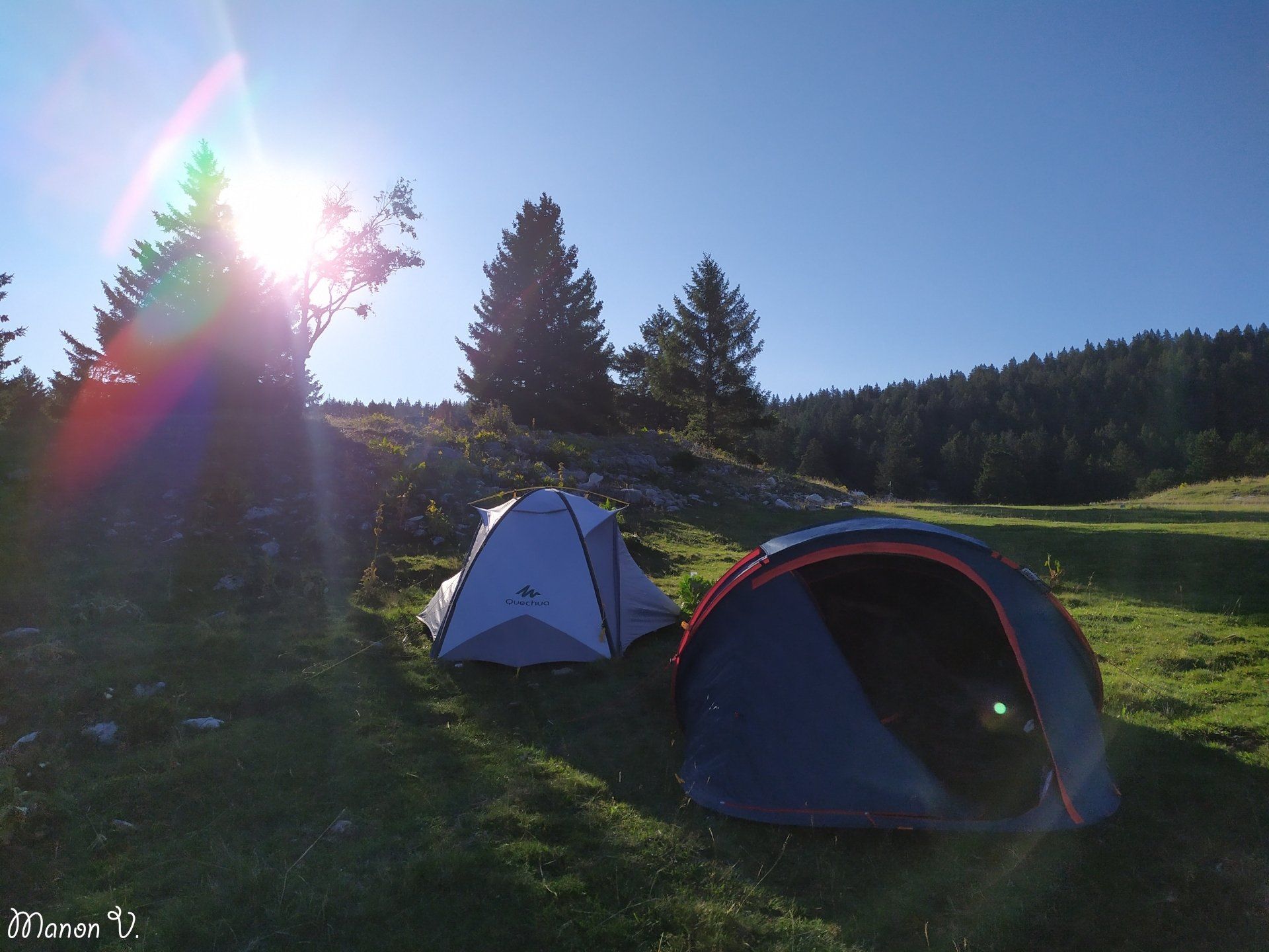 Ensuite, une fois que l’on a le lieu et que l’on est arrivé(s) sur place, il faut bien choisir où planter sa tente. Ce n’est pas très agréable de rouler dans la nuit car on n’est pas à plat. On risque de mal dormir si on a la tête légèrement plus bas que les pieds aussi ! Parcourez la surface de votre tente et testez votre installation pour vérifier qu'il n'y a pas de pierres ou autres éléments naturels qui pourraient être inconfortables. Et puis ce que j’adore faire, c’est mettre l’ouverture de la tente face à la plus belle partie du paysage : quel réveil.