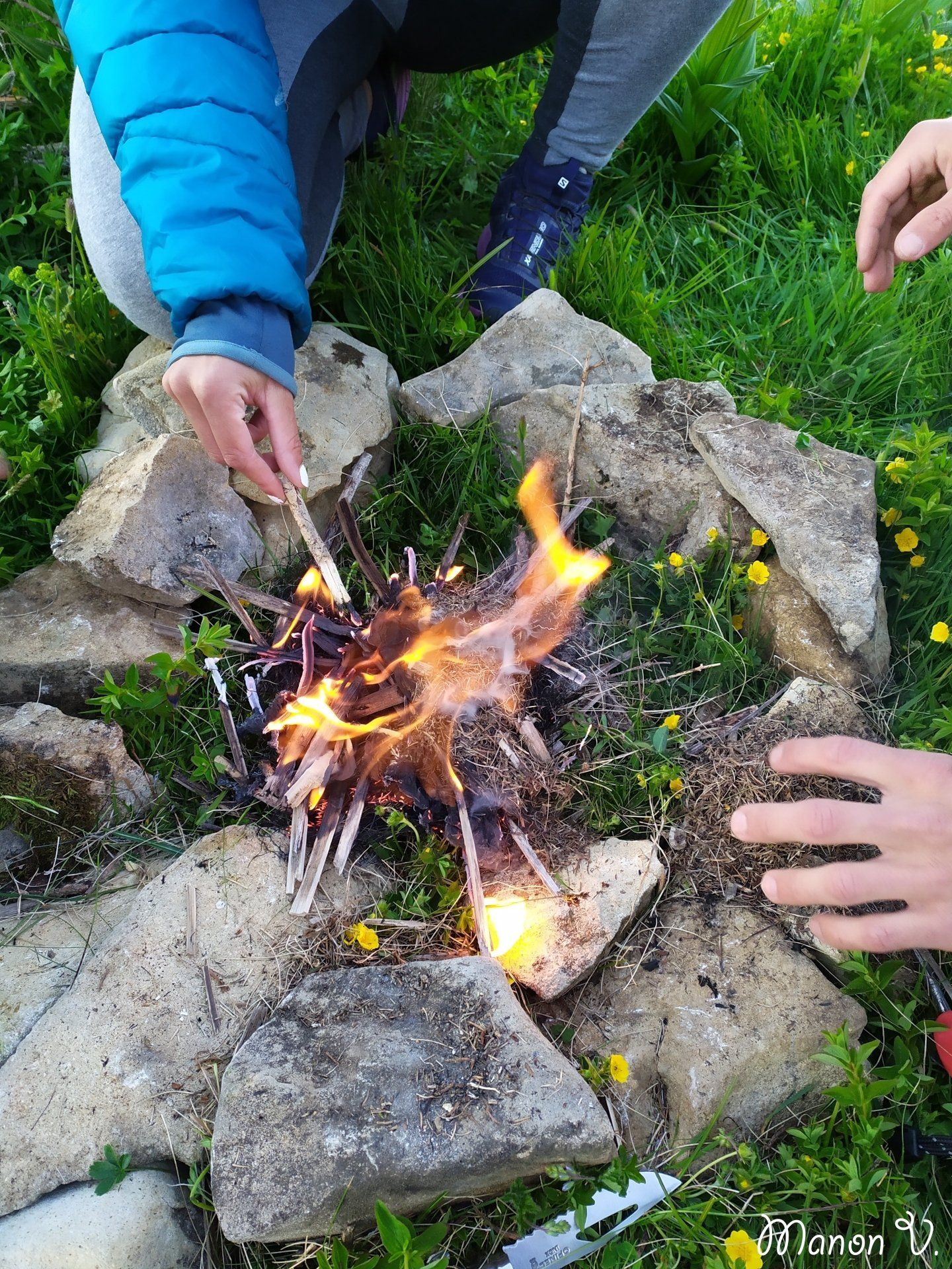 Si le feu est autorisé là où vous êtes (encore un fois, renseignez-vous), partez tout de suite dans la forêt pour ramasser les branches déjà tombées (ne coupez pas des branches d'arbre !) et du petit bois, essentiel pour faire partir votre feu. Il est nécessaire de faire cela rapidement car la nuit tombe vite et dès que le soleil se couche les températures baissent rapidement. Ne mettez pas le foyer trop près de votre tente ni de la forêt et sécurisez le feu en l'entourant avec des pierres afin que le feu ne se disperse pas. L'idéal si vous souhaitez faire un feu est de le faire là où il y a déjà un foyer existant pour ne pas abîmer la nature. Avec un briquet il est plus facile de faire partir le feu, mais on a aussi réussi avec une pierre à feu, oui oui. Cela nous a pris un peu de temps la première fois, mais c'est une belle victoire lorsque ça y est, on sent que le feu nous réchauffe.