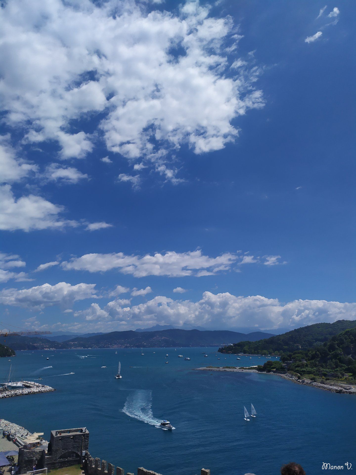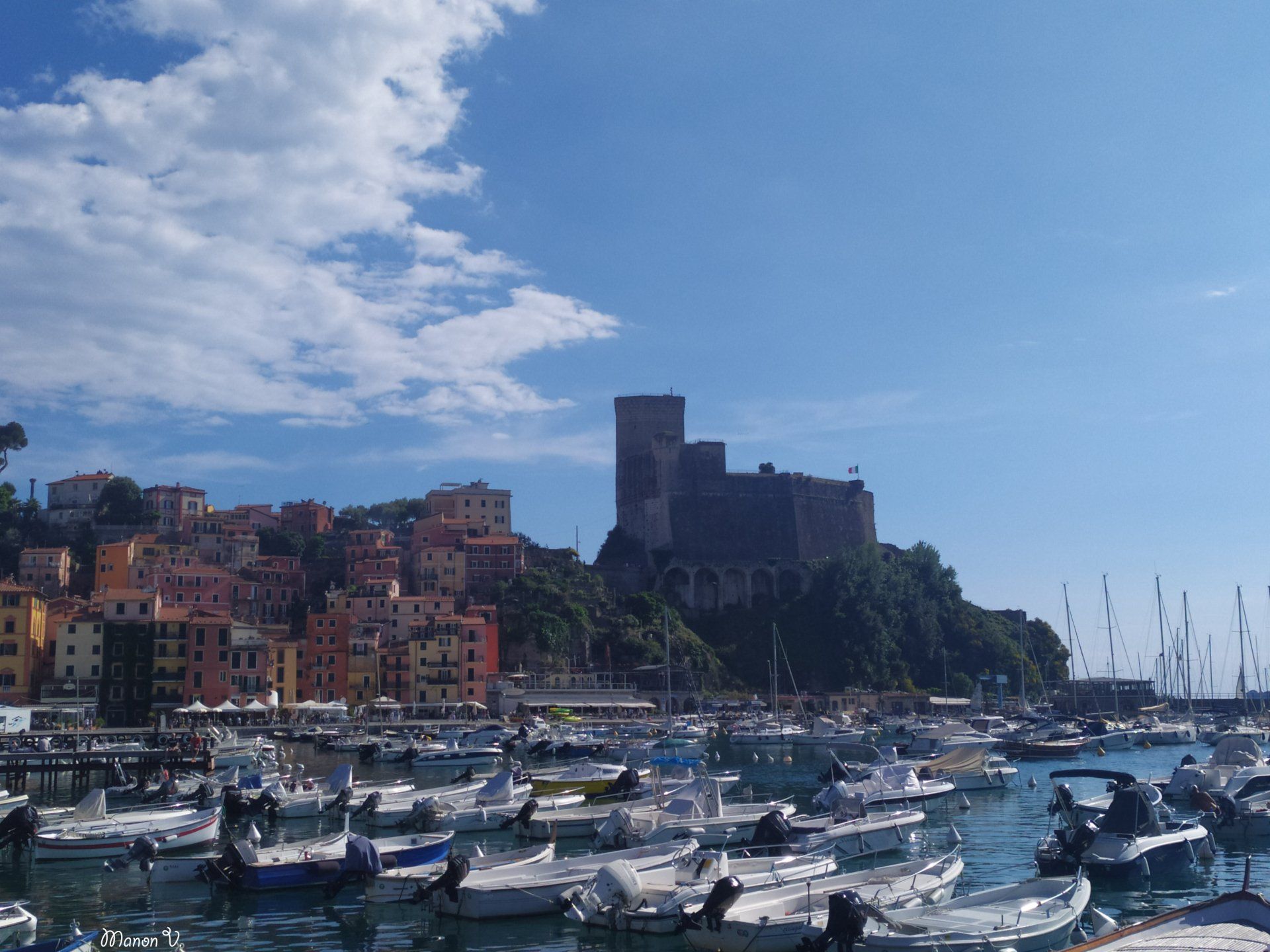 qui domine la ville, nous avons la vue sur la côte escarpée et sur l’île de Palmaria et en fond on aperçoit La Spezia.