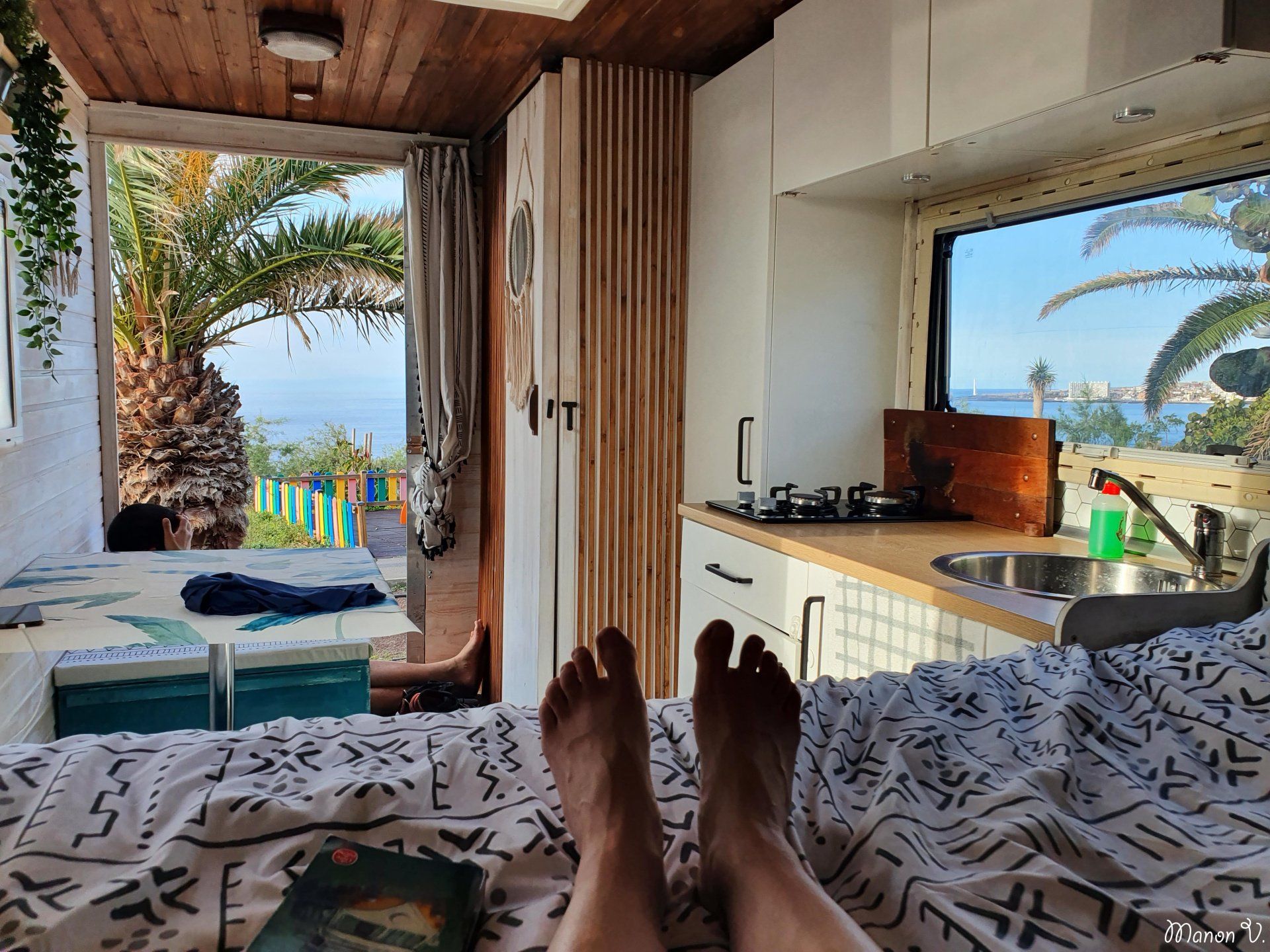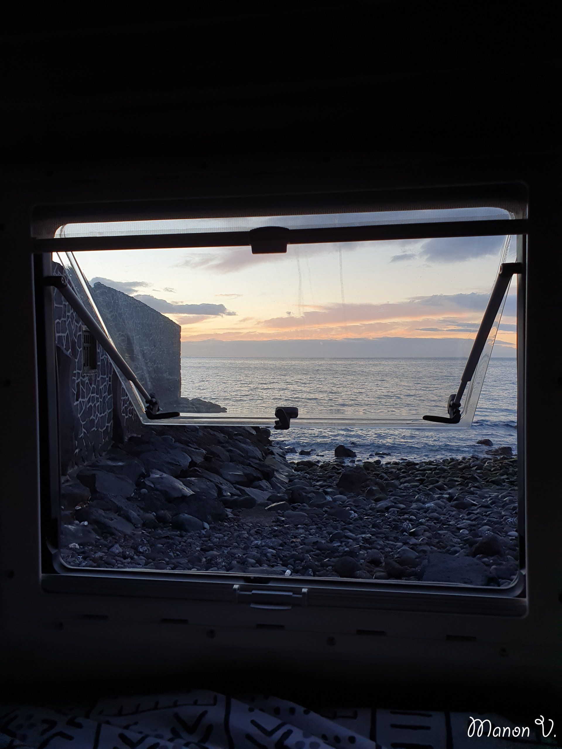 lever de soleil est là, depuis le lit, depuis la fenêtre du van on observe le lever de soleil avant d’aller courir au bord de l’eau et d’observer les crabes dans les rochers.
